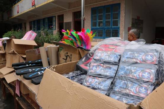 公司員工捐贈的書包體育用品等物資