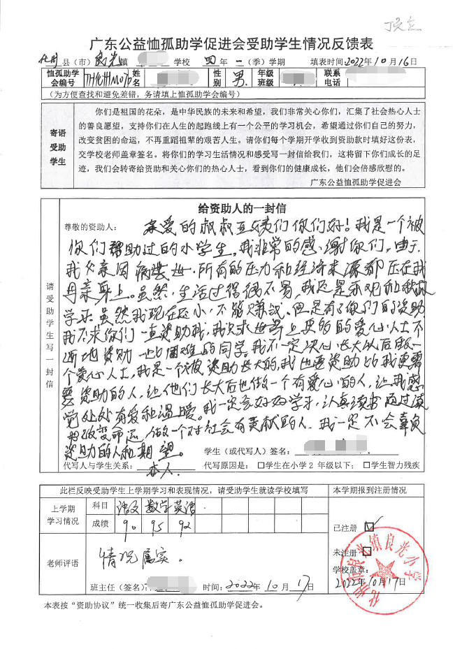 2022年7月,公司了解到廣東公益恤孤助學(xué)促進(jìn)會(huì)舉辦慈善助學(xué)活動(dòng)之后,發(fā)起了公司內(nèi)部慈善捐款活動(dòng),員工們積極參與,紛紛捐款,向有需要的學(xué)生奉獻(xiàn)愛(ài)心,向他們表達(dá)一份關(guān)愛(ài)。也許我們的愛(ài)心微不足道,但卻緩解了他們?cè)趯W(xué)業(yè)上一定程度的經(jīng)濟(jì)壓力,改善了他們的學(xué)習(xí)和生活環(huán)境,也給他們帶來(lái)了希望。近期,廣東公益恤孤助學(xué)促進(jìn)會(huì)將學(xué)生情況反饋表及受助學(xué)生對(duì)捐助人的一封信郵寄到公司,反饋了受助學(xué)生的學(xué)習(xí)生活情況,反饋表及信函里記錄著受助學(xué)生對(duì)學(xué)習(xí)的熱愛(ài),也表達(dá)著他們對(duì)捐助人的感激之情,可以說(shuō)我們小小的舉動(dòng)給他們帶來(lái)了莫大的支持。